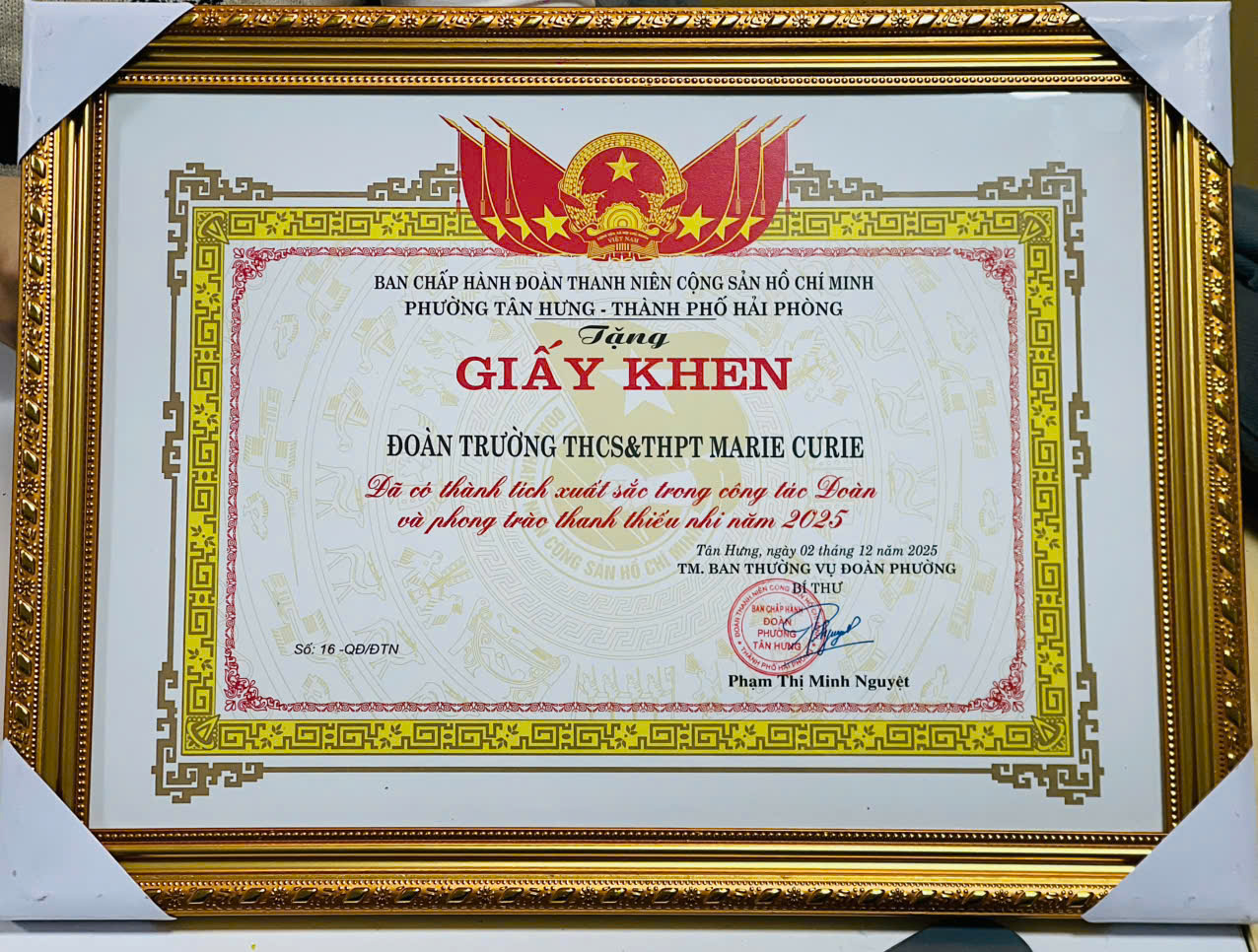 (Đại diện BCH Đoàn TNCS Hồ Chí Minh Trường THCS&THPT Marie Curie nhận Giấy khen)